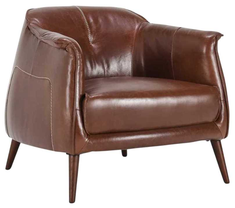 Add timeless character to your living space with this beautifully crafted accent chair made from rich top grain leather and solid oak wood. Supple upholstery wraps the gently curved silhouette, creating an inviting seat for relaxing or conversation. Tapered wood legs add warmth and mid-century charm, while deep cushioning offers lasting comfort.Read More