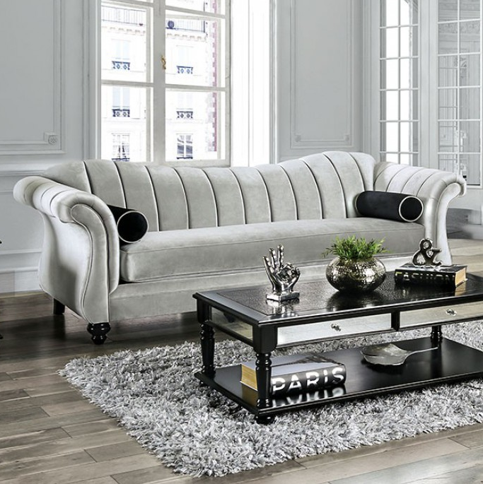 A seashell tufting is absolutely stunning. The rolling curves of sofa set design is enhanced by the deep lines of the tufting. Dark lumbar pillows offer the perfect countershading for the set. Single seat cushions help the pieces feel put together and unified. Invite some friends over and have them nestle up against the plush padding and relax for a spell.