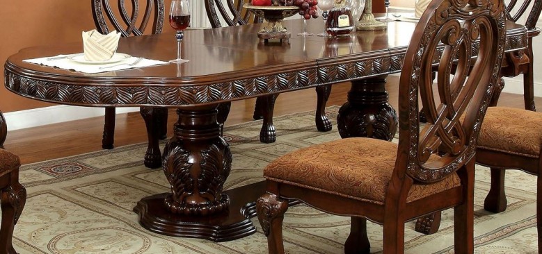 Royal presence - Stately profiles and dramatic curves are further emphasized by a lustrous finish. Intricate carvings, dramatic base and table top accents elevate your dining style. Beautiful dining table ushers a rich history and sense of tradition into your dining room. Matching hutch and buffet available.Read More