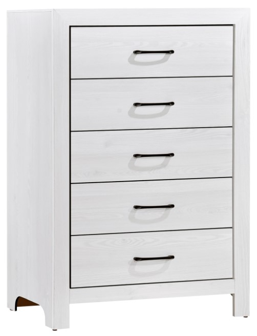 Modern lines and rustic styling are paired to create the look of the Corbin Collection. The 3D printed paper veneer’s texture is highlighted by a white finish for a realistic wood look. Providing complementing contrast, the drawer fronts of the chest feature black metal hardware.Read More