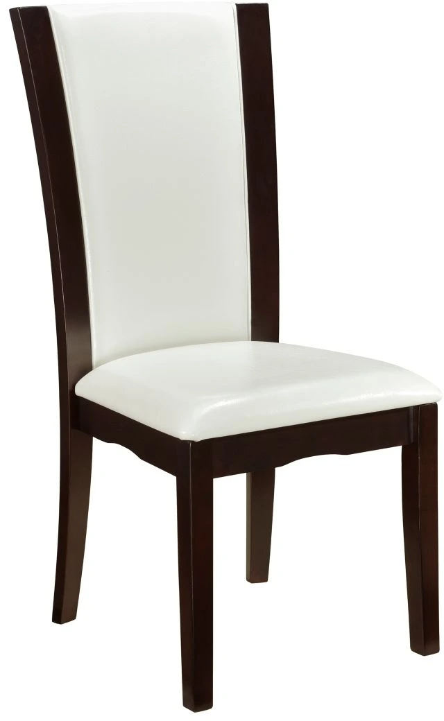 Daisy Collection combines superb visual appearance and fine quality that you need in your dining area. The dining height side chair features clean lines and sleek curves paired with white faux leather. The framing of the chair constructed of hardwood solids and veneers in a refreshing espresso finish.Read More