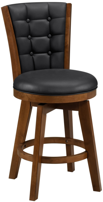 Meeting the needs of your tabletop height, the 24-inch counter-height chair allows for perfect placement within your casual dining space. The wood frame of the chair is finished in chestnut while the seat and button-tufted back are covered in black faux leather.