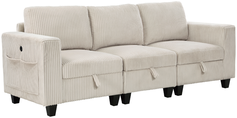 Pull-out storage drawers are neatly tucked beneath the armless chair and end seats of the sofa, each drawer easily accessible with a pull to the front-mounted loop handle. The paired end seats arm's provide side support and power charging ports. The collection is covered in beige corduroy fabric for a neutral complement to your home’s décor.