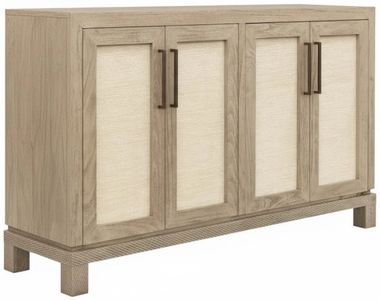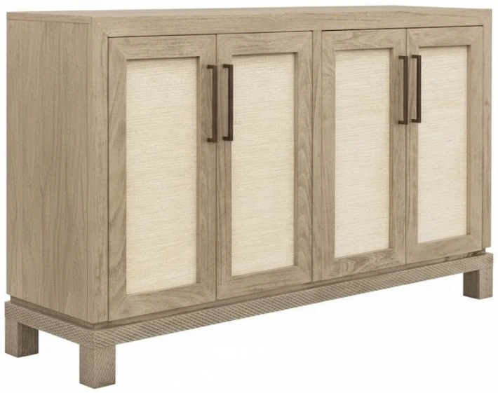 Bring warmth and character to your home with the Solara console, expertly handcrafted from solid melina wood and finished in a white lacquer. The door panels are adorned with woven yucca fiber, and the base features CNC-machine textured, providing a touch of organic charm and elegance.Read More