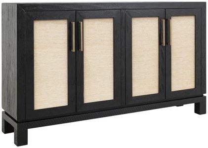 Bring warmth and character to your home with the Solara console, expertly handcrafted from solid melina wood and finished in a rich black lacquer. The door panels are adorned with woven yucca fiber, and the base features CNC-machine textured, providing a touch of organic charm and elegance.Read More