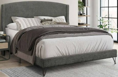 The dark gray fabric upholstered wingback eastern king platform bed boasts angled hairpin metal front legs and arrives fully slatted, removing the necessity for a bunkie board. Its sleek design combines style with practicality.Read More