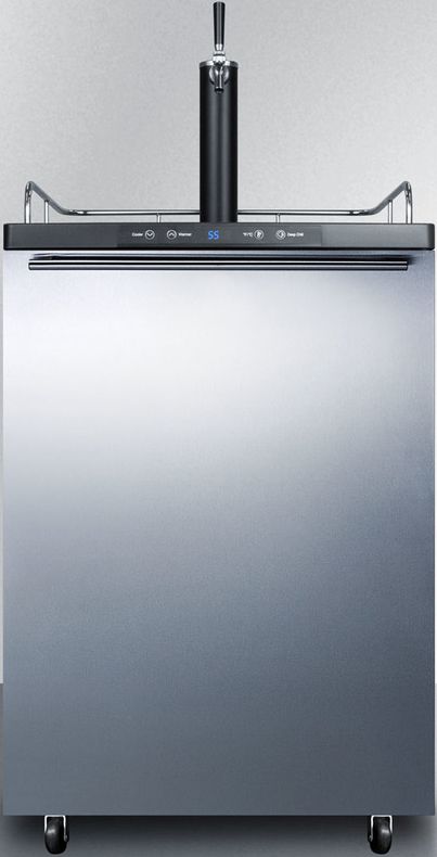 Summit Appliance offers a versatile line of full-sized freestanding beer dispensers designed for low maintenance storage in the style of your choice. The SBC635MSSHH features a large interior that can hold a full half, quarter, 0.17" or mini keg. It comes in a jet black cabinet with a matching Sankey tower. The surface includes a removable drip tray to collect spills and a chrome guard rail to help keep glasses and mugs in place. We include a set of locking casters for easy mobility. This unit features a reversible stainless steel wrapped door with a thin horizontally mounted handle for a sleek, modern look. Automatic defrost operation ensures minimum user maintenance inside the 5.6 cu.ft. interior. A digital thermostat makes it easy to manage the temperature at the touch of a button. The external digital display shows the temperature in Celsius or Fahrenheit to ensure your beer is stored exactly how you like it. Our American Sankey tap kit includes all the accessories you need for draft service, including a 5 lb. CO2 tank and regulator. The floor is reinforced with a steel cover for added durability when loading kegs. This unit is designed for freestanding use. For built-in applications, see the SBC635MBISSHH.