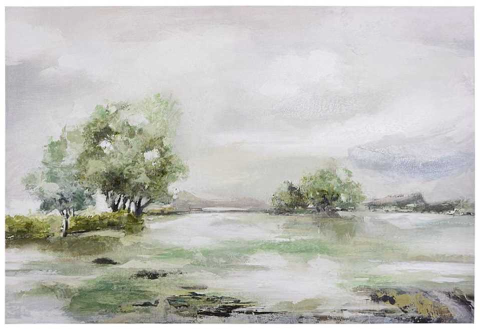 A tranquil lake makes up the forefront of this hand painted acrylic canvas as lush green trees sway gently in the background beneath a slate grey sky. At any moment the heavens could open up and pour rain down onto the waiting scene below, but for this moment everything is calm.Read More
